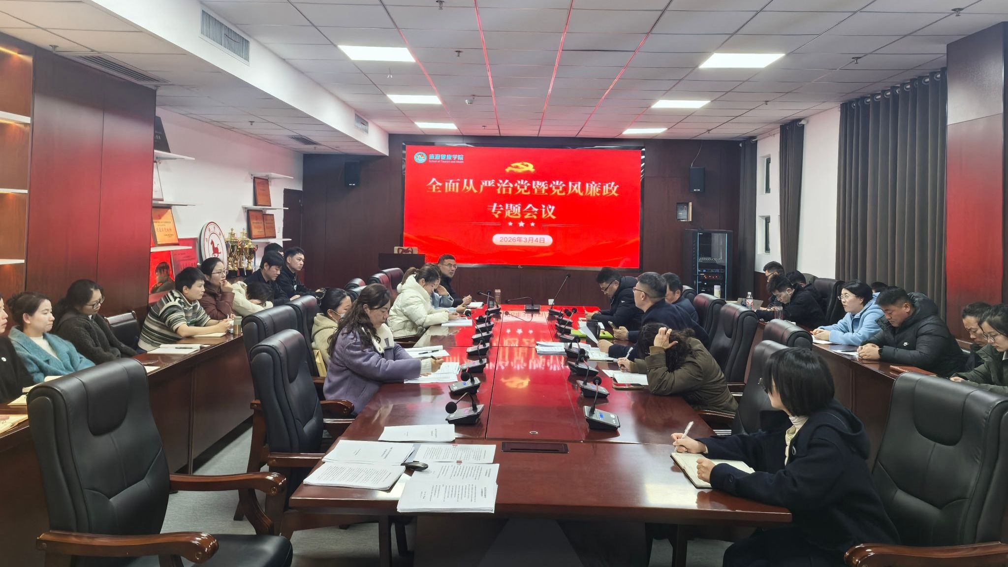 为深入推进全面从严治党,强化师德师风与纪律作风建设,筑牢校园廉洁防线,3月4日下午,旅游健康学院党总支召开新学期党风廉政建设专题会议。学院全体教师参加会议,会议由党总支书记杨锐主持。