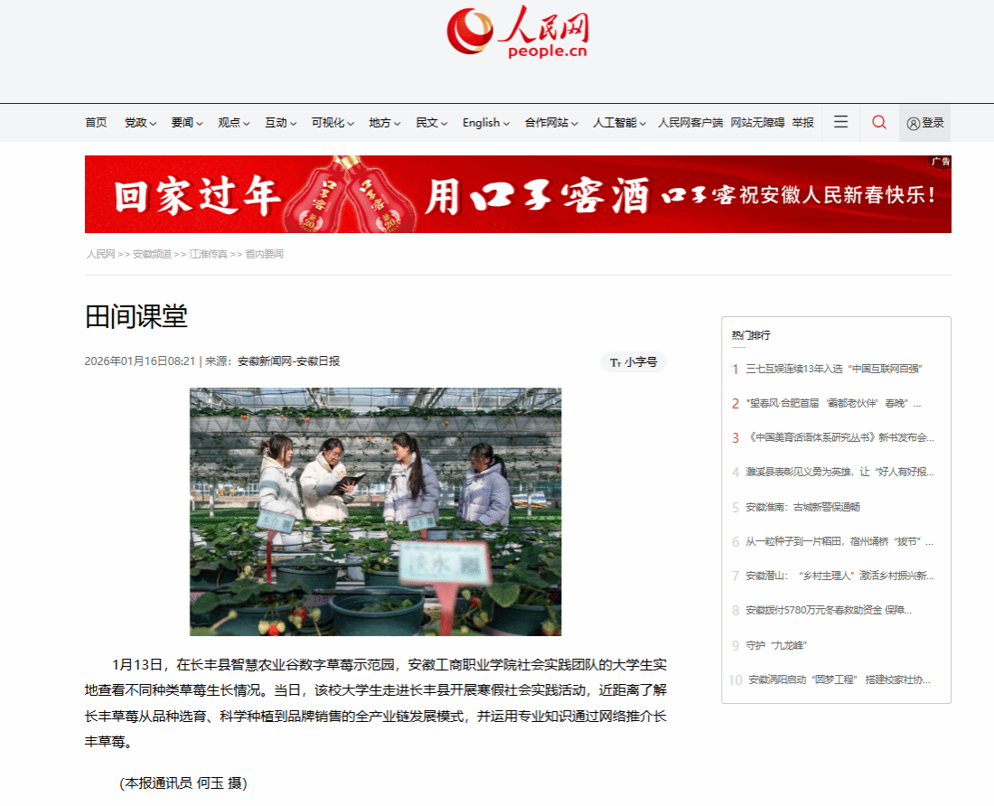 近日,学习强国、人民网、安徽日报等多家主流媒体集中报道了我校信息工程学院2026年寒假“返家乡”社会实践活动,引发社会关注。寒假期间,学院“数智助农·E路莓好”社会实践团队赴合肥市长丰县水湖镇,开展以“青春为中国式现代化挺膺担当”为主题的社会实践活动。团队深入长丰县智慧农业谷数字草莓示范园,系统调研草莓产业在品种选育、智慧种植及品牌营销等环节的全链条发展模式,充分发挥专业优势,运用新媒体新技术,通过网络平台积极推介长丰草莓,以青春力量助力家乡农业品牌建设与产业振兴。
