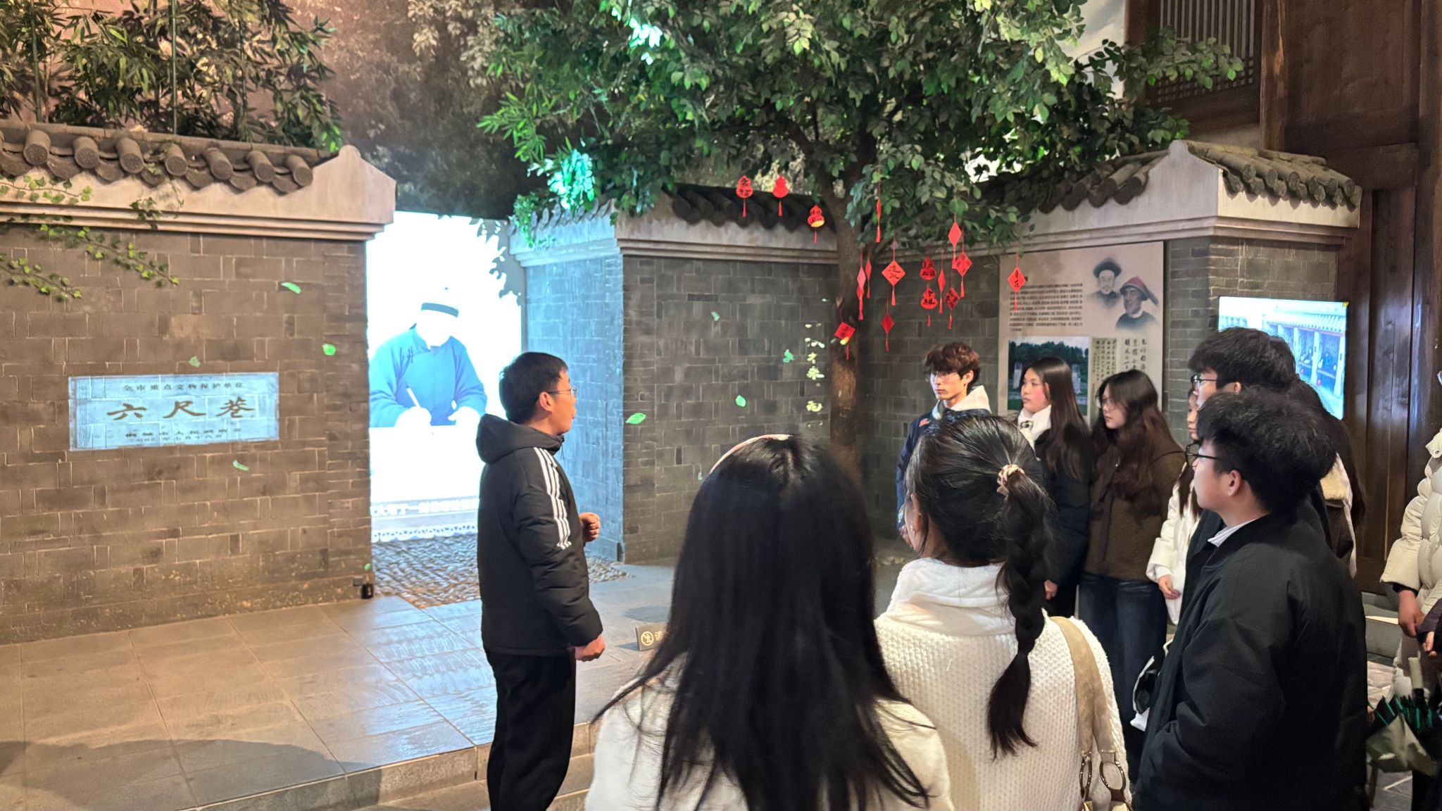 在安徽名人馆“明清徽州文化”展厅,师生们驻足于六尺巷的复原场景前。旅游健康学院团总支书记殷宏伟以清代大学士张英“一纸书来只为墙,让他三尺又何妨”的家书为引,讲述了桐城六尺巷“以和为贵”的典故。同学们通过互动展项,触摸“礼让墙”上的浮雕,观看《朱子家训》《诫子书》等典籍的动态投影,沉浸式感受“上善若水”“和而不同”的哲学思想,汲取中华优秀传统文化的智慧。随后,24旅游管理3班王楠同学带领大家研读了《习近平与大学生朋友们》第二卷中“南开之行”的篇章。2019年1月17日,习近平总书记在南开大学考察时,以“允公允能,日新月异”的校训勉励青年:“只有把小我融入大我,才会有海一样的胸怀,山一样的崇高。”这一嘱托与六尺巷精神形成跨越时空的呼应。最后,同学们结合《习近平与大学生朋友们》第二卷中“把小我融入大我”的嘱托,共同探讨了新时代青年的责任与担当。