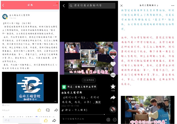 3月29日至30日,应用工程学院组织20级团学干部,通过线上合唱的方式,“云”端录制了《我们心在一起》视频,并发布于学院微信、QQ、抖音等网络平台,得到广大师生的一致好评。