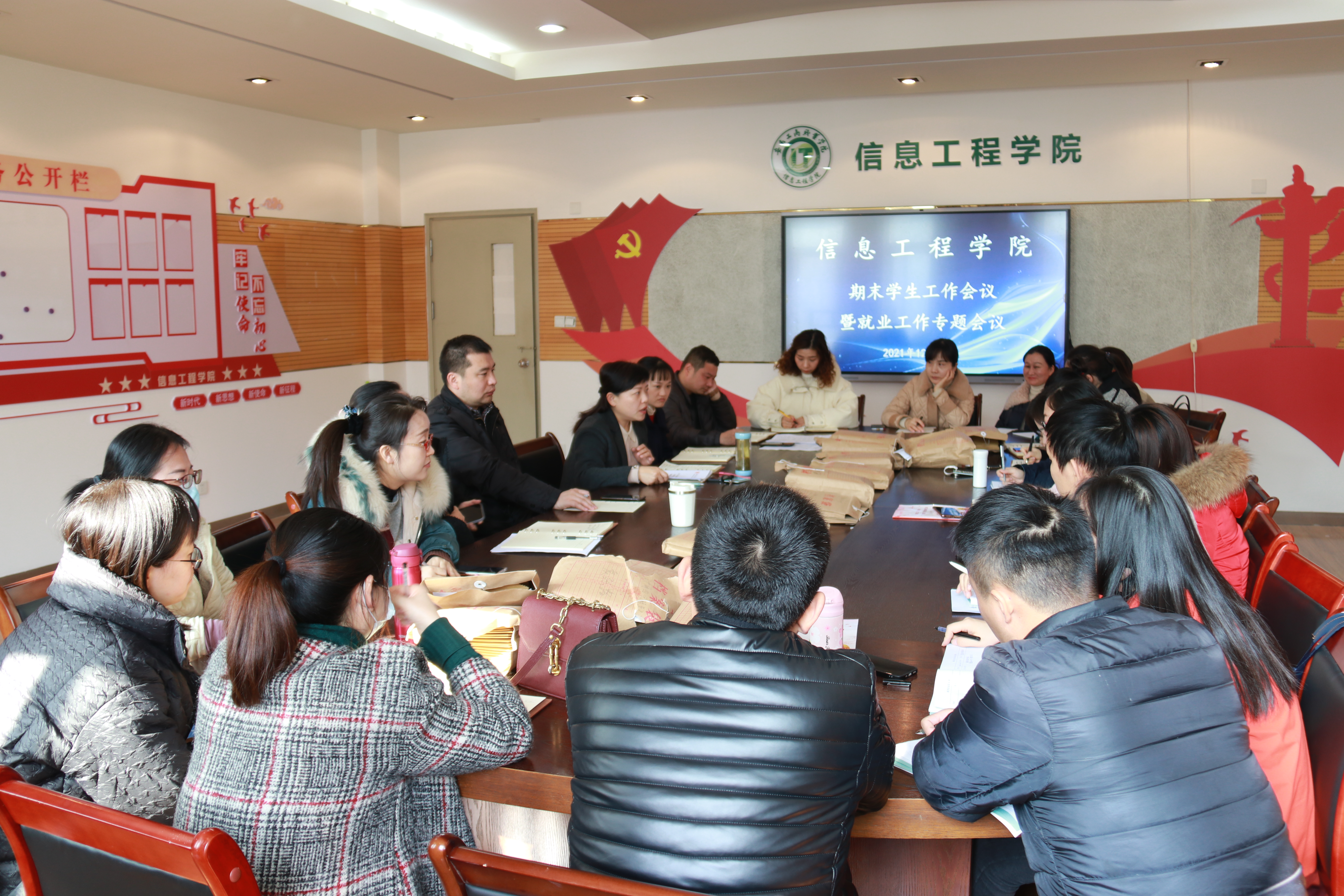 为传达近期学校召开的期末学生工作例会暨就业工作专题例会相关内容及精神,总结学院本学期学生管理各项工作,安排部署期末主要工作,12月23日,信息工程学院于307会议室召开期末辅导员工作例会暨就业工作专题会议,学院全体辅导员参加会议,会议由党总支书记张静雯主持。