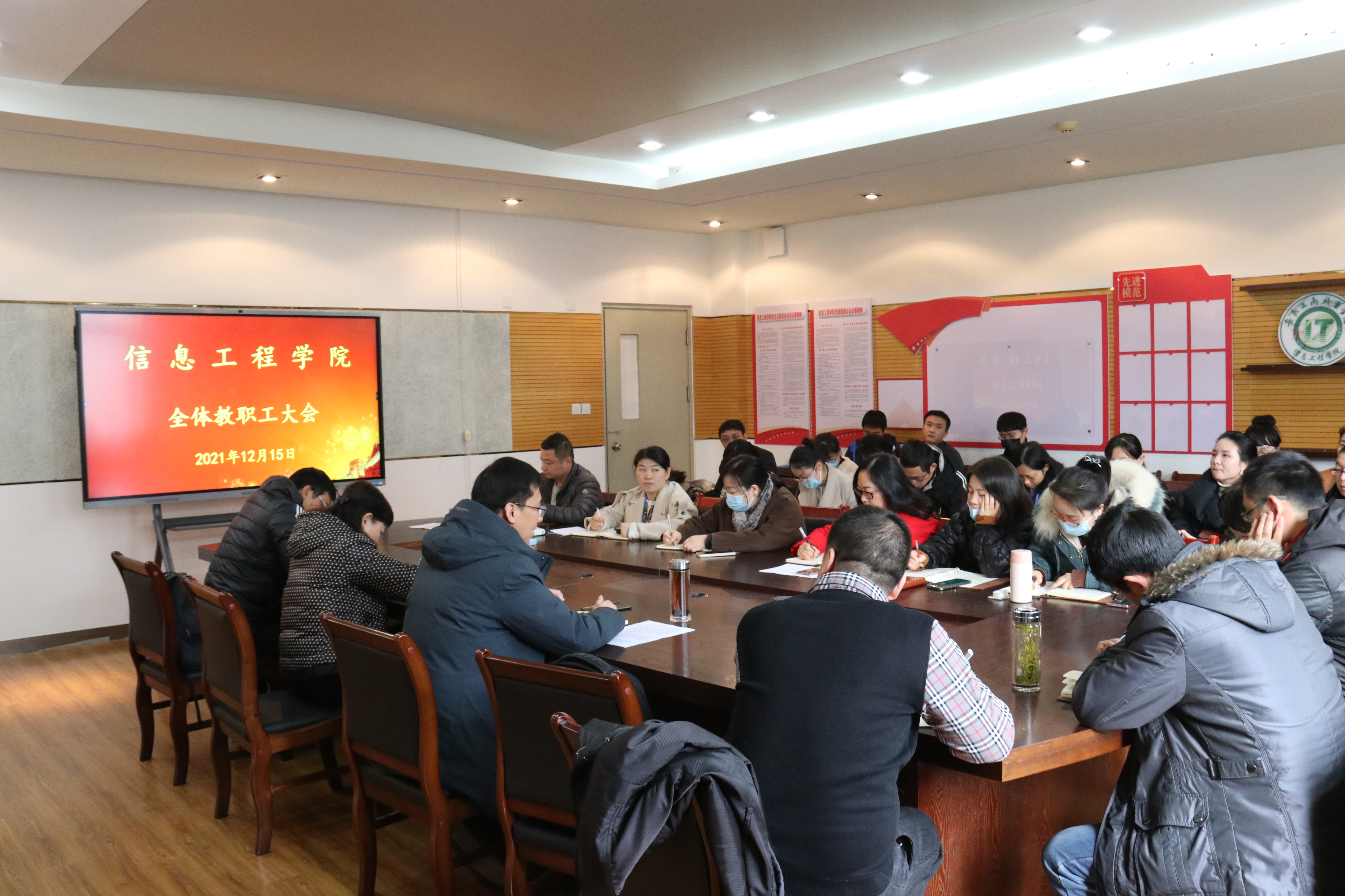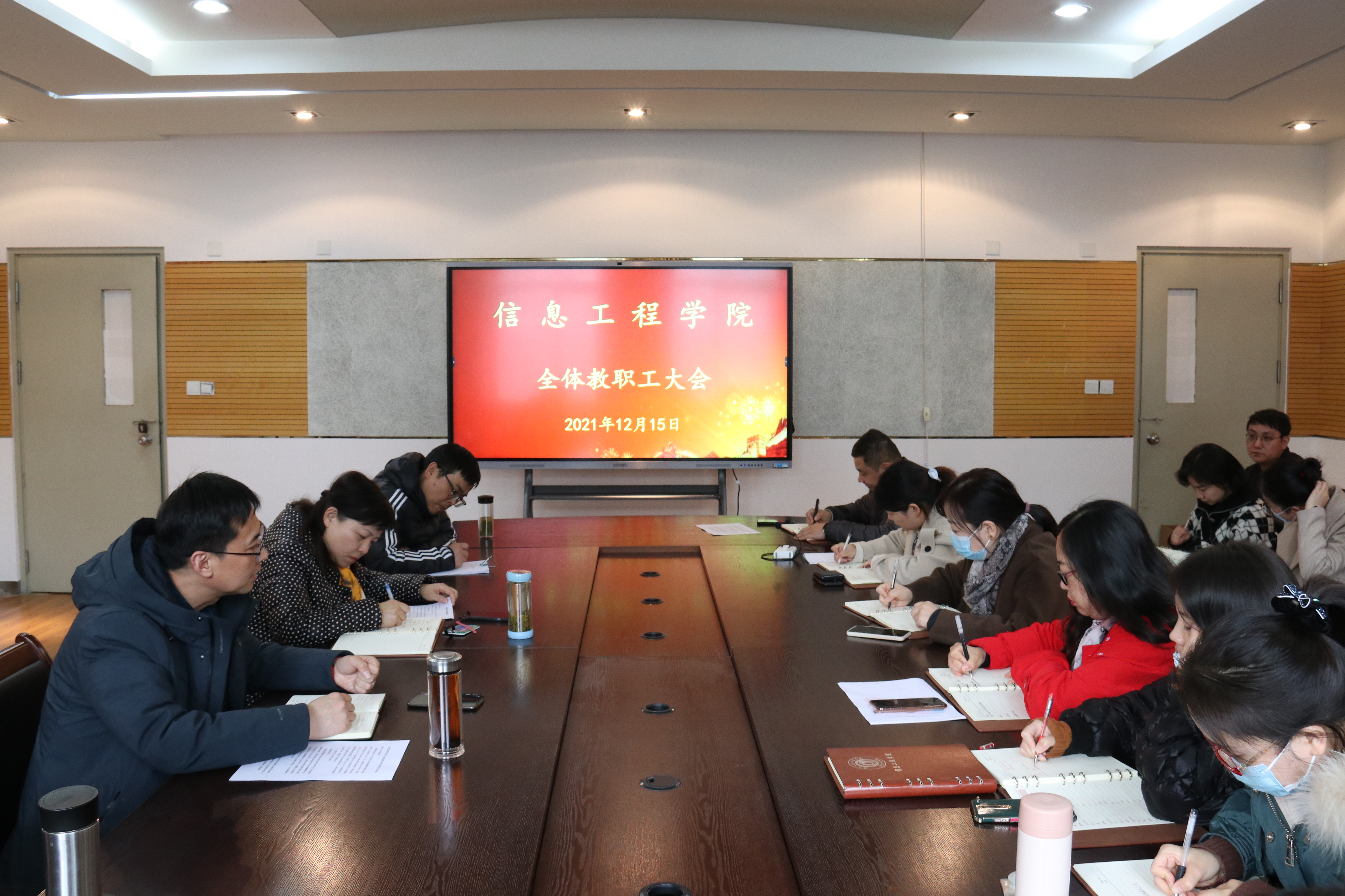 为传达学校近期召开教学工作例会精神,总结学院近期教学各项工作,部署安排下一步主要工作,12月15日下午,信息工程学院在307会议室召开学院全体教职工会议,信息工程学院党总支书记张静雯及全体教师参会,会议由信息工程学院院长范生万主持。