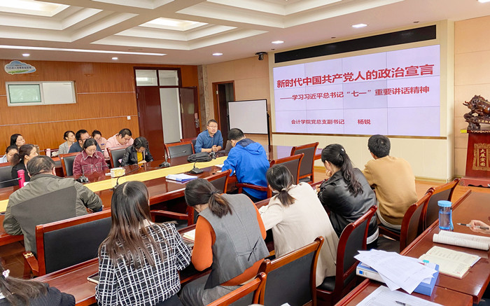 为深入学习贯彻习近平总书记“七一”重要讲话精神,不断推进党史学习教育,10月13日会计学院党总支副书记杨锐为全体教职工讲授“新时代中国共产党人的政治宣言——学习习近平总书记‘七一’重要讲话精神”专题党课,会计学院院长高克智和全体教职工聆听了本次党课。