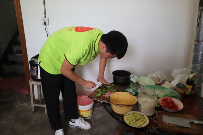 一到曾奶奶家,队员们顾不上擦拭脸颊上的汗水,七手八脚地帮着曾奶奶打扫院落、收拾屋子;几名女队员钻进了厨房,蹲在地上开始收拾带来的鸡、鱼和蔬菜等食材;其他几名队员把周边的困难老人也都邀请来,准备中午给老人家们做一顿满满爱意的午餐。队员们和老人们自由交谈的同时,认真倾听老人们讲述着近几年乡村变化的经历。同学们也把自己在外读书情况以及家乡情况给老人们一一讲述。队员们的到来使原本孤寂的院落充满了欢声笑语。屋外烈日炎炎,犹如屋内暖意融融。