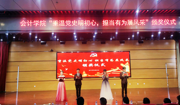 为进一步引导大学生构筑自己的精神大厦,坚定为中华民族的伟大复兴贡献青春的力量,继承党的光荣传统和优良作风,坚定广大青年团员永远跟党走的政治信念,6月21日会计学院在学术报告厅开展了2020--2021学年“重温党史明初心、担当有为展风采”颁奖仪式,出席活动的有党总支副书记杨锐,部分19、20级班级辅导员。