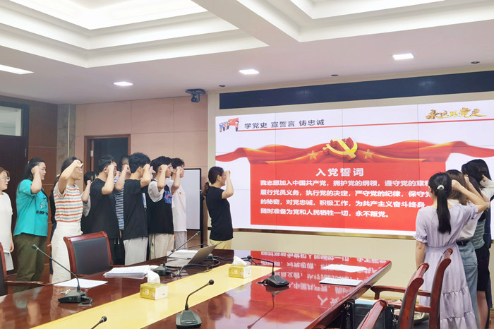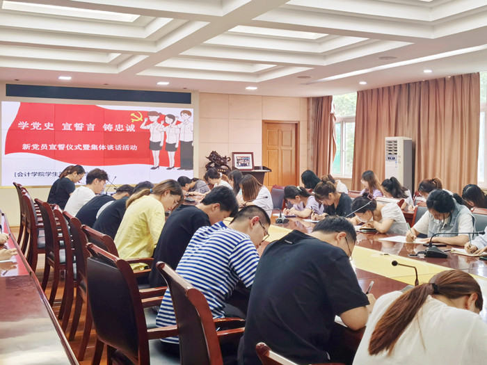 根据《党员发展工作细则》要求,为使上级党总支全面了解预备党员的思想情况,保证发展党员质量,并对新发展党员进一步帮助教育,会计学院学生第一党支部于2021年6月17日下午在明德楼二号会议室开展了“学党史·宣誓言·铸忠诚”新党员宣誓仪式暨集体谈话活动,党总支组织委员费玄淑出席本次座谈会,活动由支部书记余想花主持。