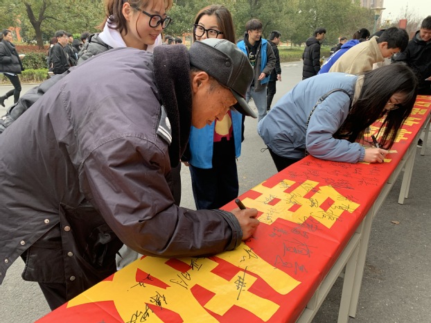 三月的寒风依然凛冽,却挡不住同学们的满腔热情。活动现场,志愿者热情地向同学们宣讲雷锋的故事,路过的同学们纷纷驻足聆听。同学们热情高涨,积极响应,百余名同学纷纷在横幅上郑重签下自己的名字,表达对雷锋同志的崇高敬意,和以雷锋同志为榜样、向雷锋同志学习的决心。