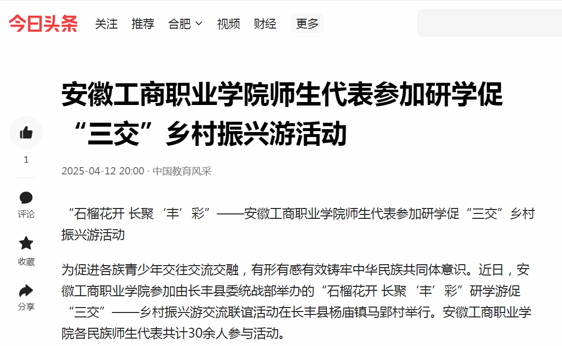 下一条:【中国网】报道:“石榴花开 长聚‘丰’彩”——安徽工商职业学院师生代表参加研学促“三交”乡村振兴游活动