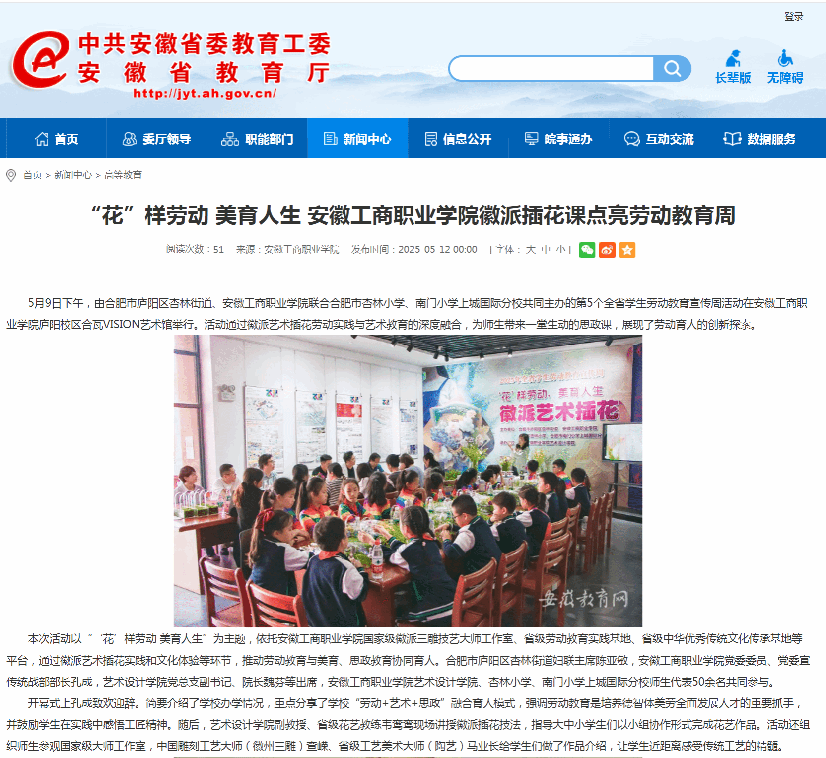 原文链接:【安徽教育网】首页报道:“花”样劳动 美育人生 安徽工商职业学院徽派插花课点亮劳动教育周