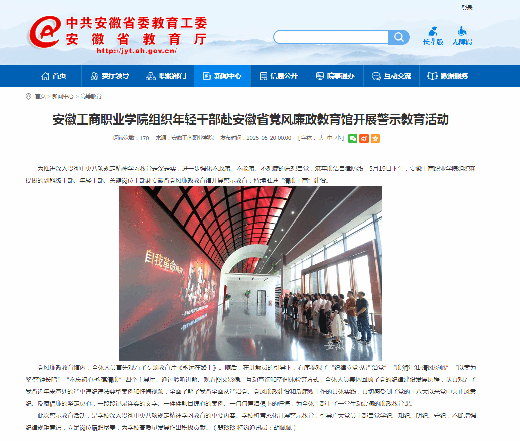 原文链接:【安徽教育网】首页报道:安徽工商职业学院组织年轻干部赴安徽省党风廉政教育馆开展警示教育活动