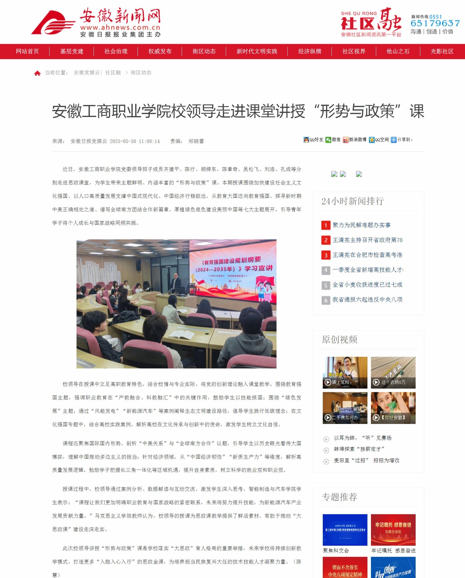 原文链接:【安徽新闻网】报道:安徽工商职业学院校领导走进课堂讲授“形势与政策”课
