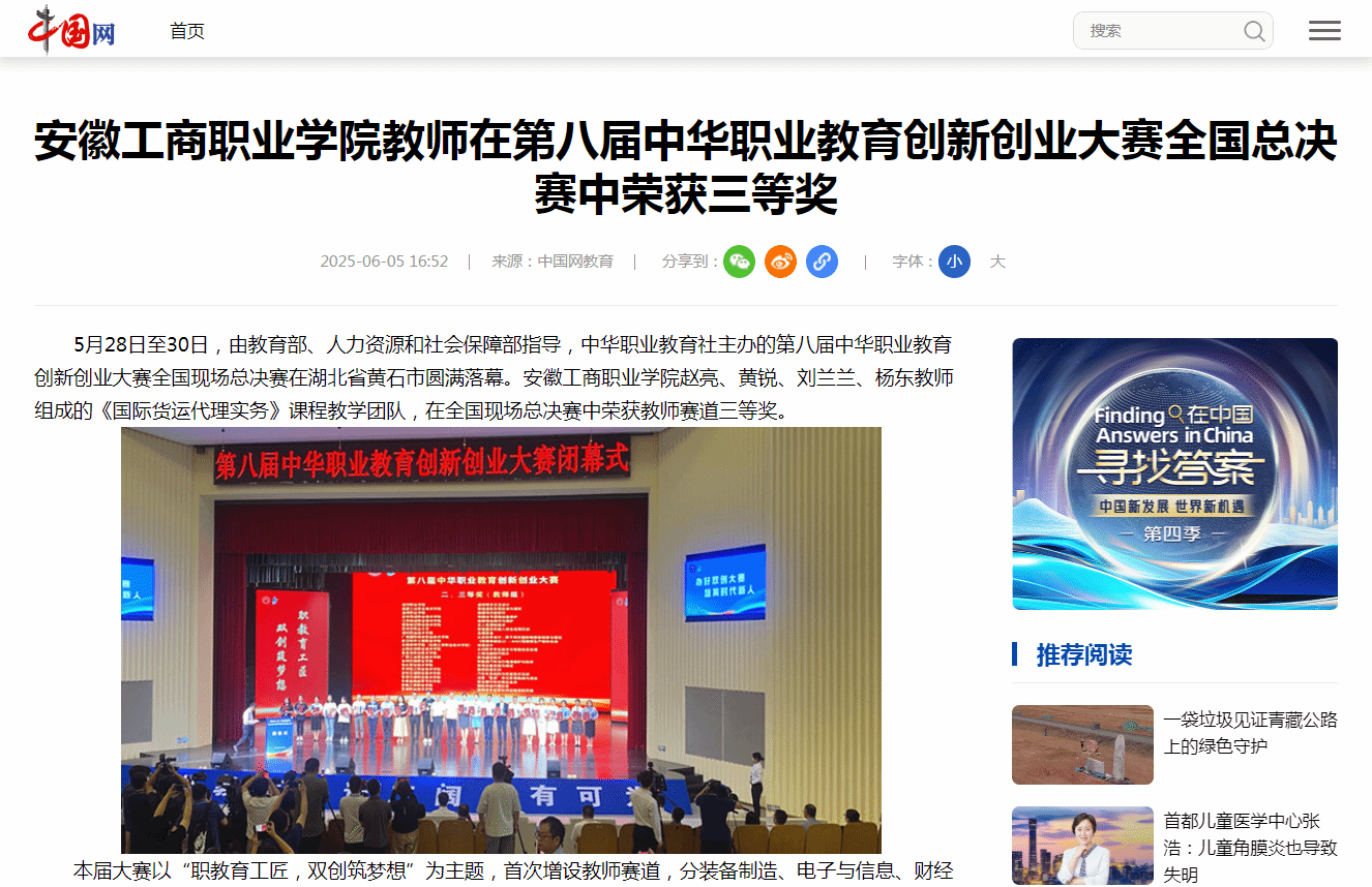 原文链接:【中国网】报道:安徽工商职业学院教师在第八届中华职业教育创新创业大赛全国总决赛中荣获三等奖