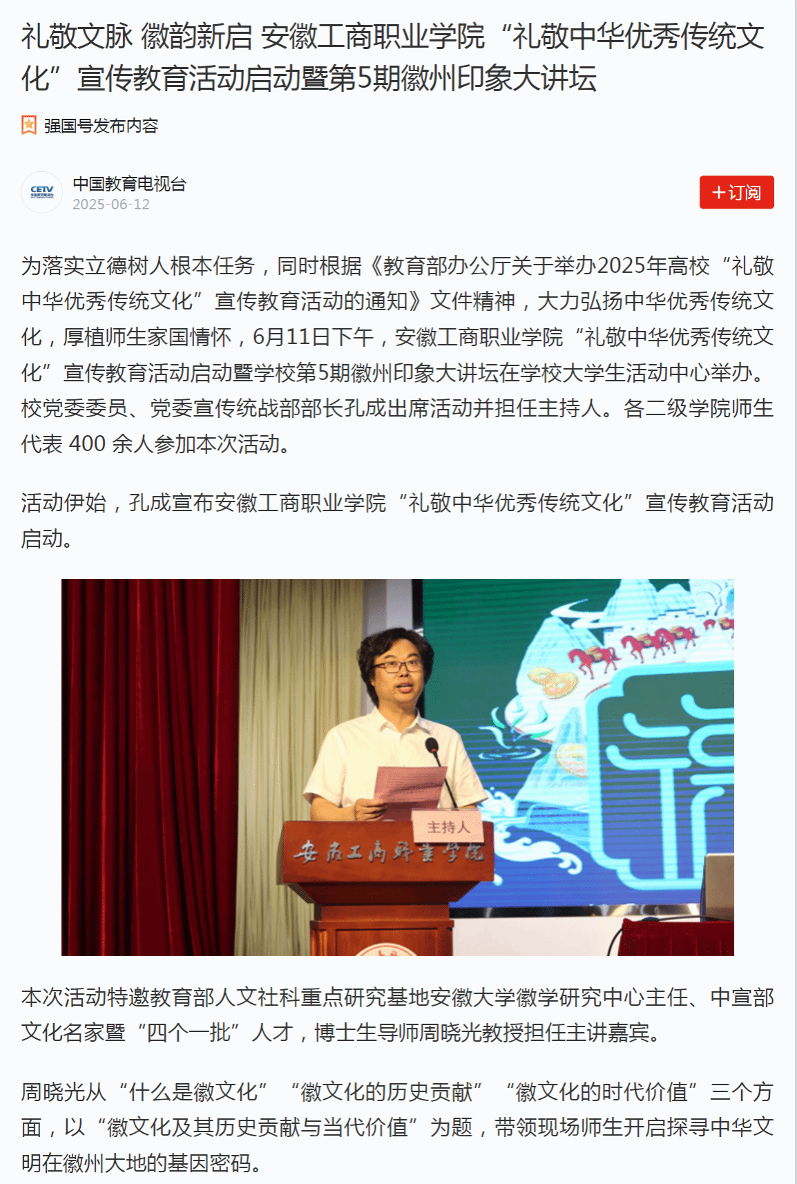 【学习强国】发布:礼敬文脉 徽韵新启 安徽工商职业学院“礼敬中华优秀传统文化”宣传教育活动启动暨第5期徽州印象大讲坛