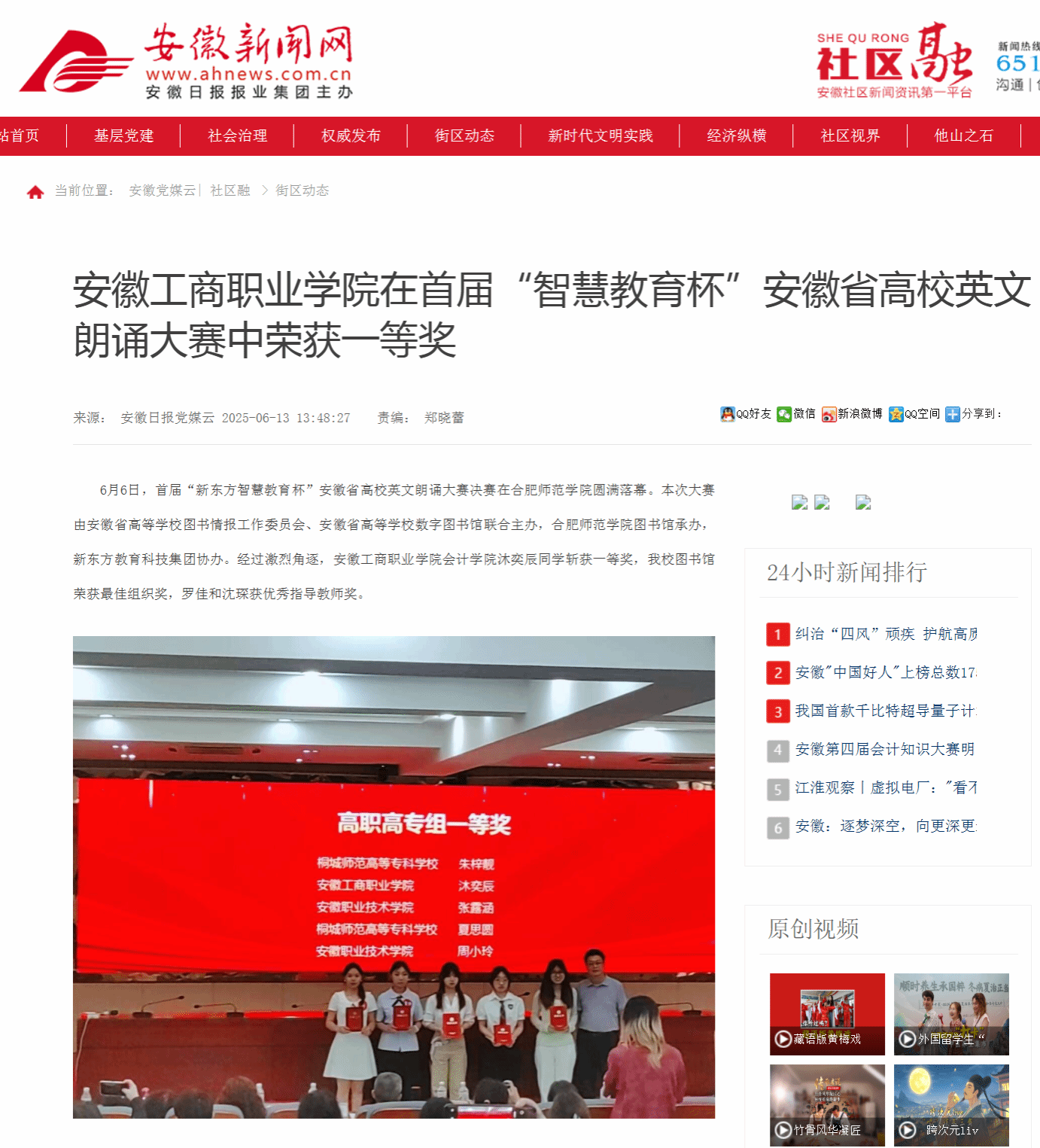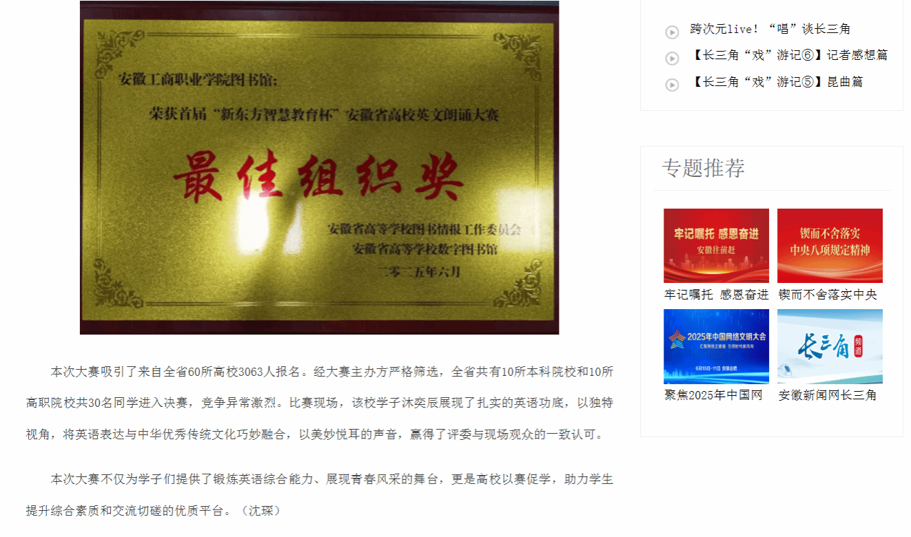 【安徽新闻网】报道:安徽工商职业学院在首届“智慧教育杯”安徽省高校英文朗诵大赛中荣获一等奖