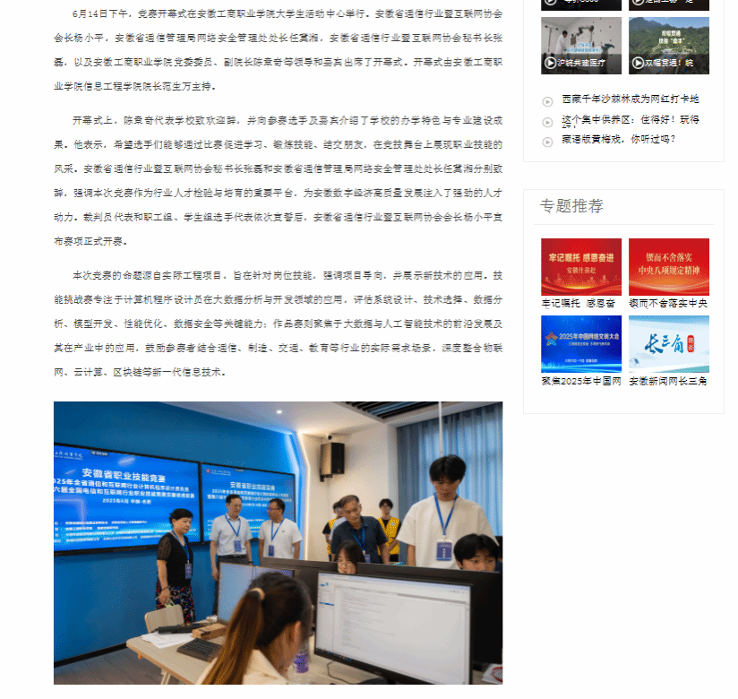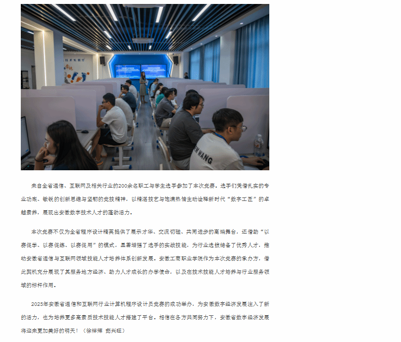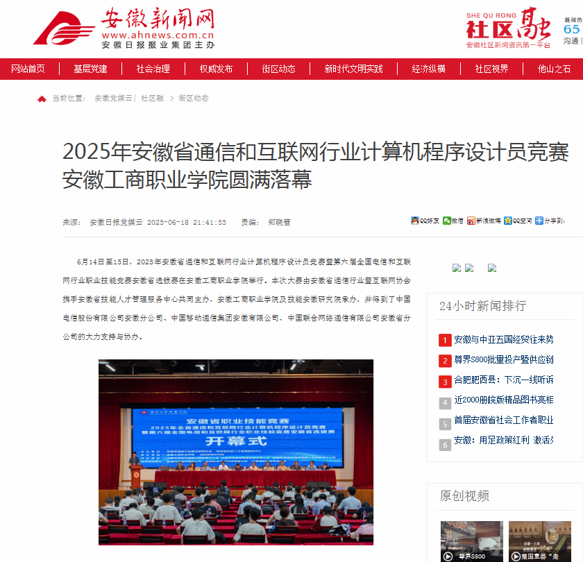 原文链接:【安徽新闻网】报道:2025年安徽省通信和互联网行业计算机程序设计员竞赛安徽工商职业学院圆满落幕