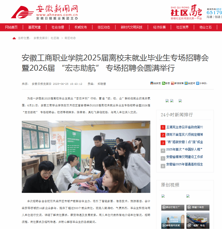 原文链接:【安徽新闻网】报道:安徽工商职业学院2025届离校未就业毕业生专场招聘会暨2026届 “宏志助航” 专场招聘会圆满举行