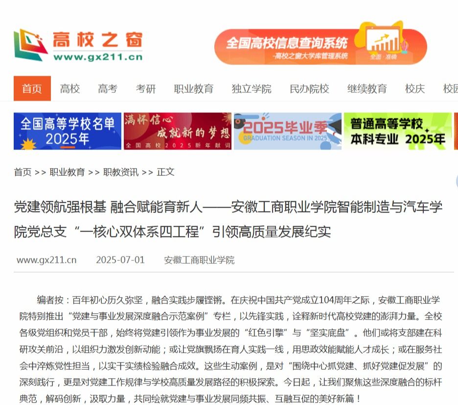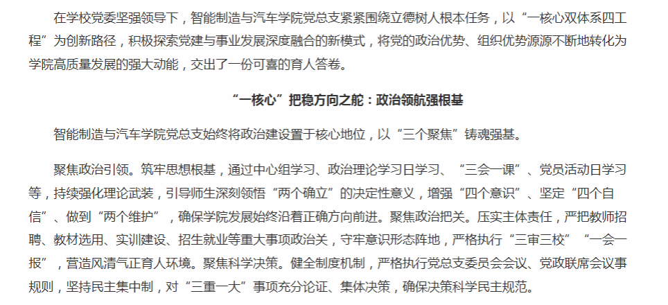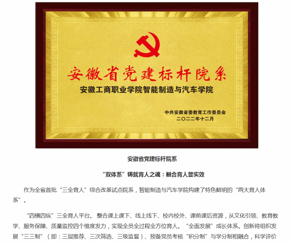 原文链接:【高校之窗】报道:党建领航强根基 融合赋能育新人——安徽工商职业学院智能制造与汽车学院党总支“一核心双体系四工程”引领高质量发展纪实