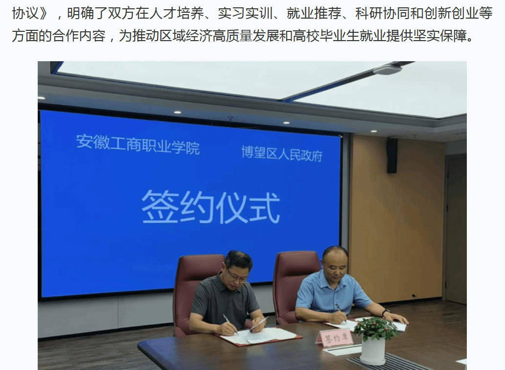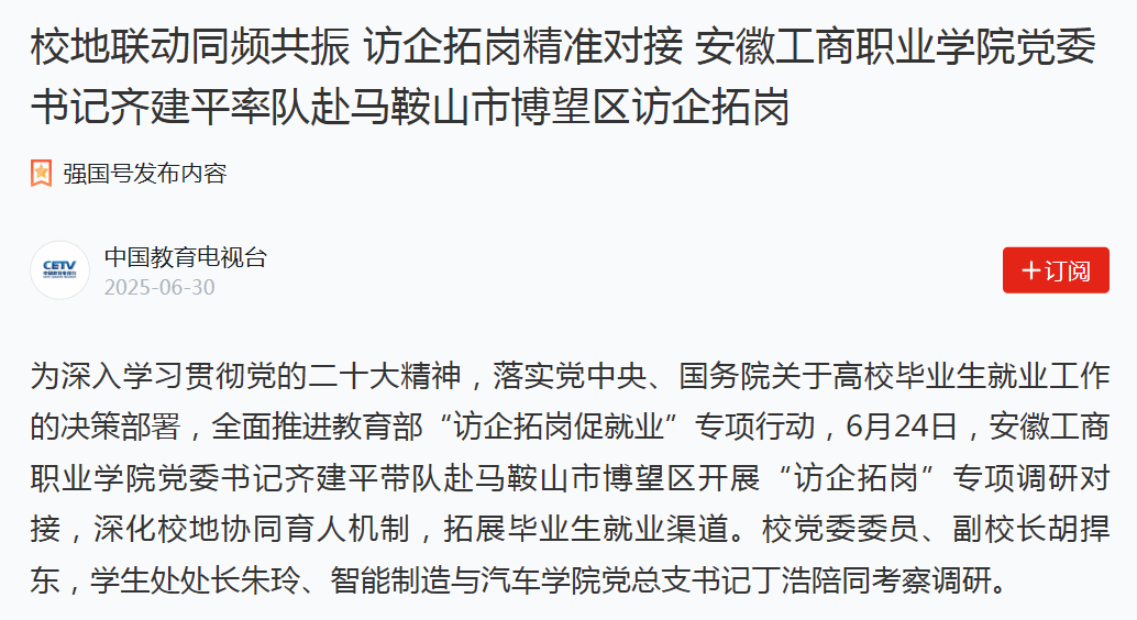 上一条:【中国教育电视台官网】报道:校地联动同频共振 访企拓岗精准对接 安徽工商职业学院党委书记齐建平率队赴马鞍山市博望区访企拓岗