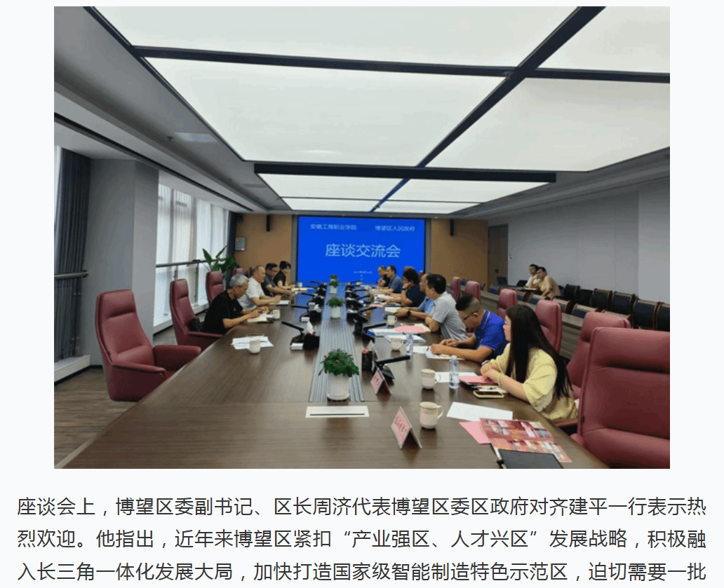 原文链接:【学习强国】报道:校地联动同频共振 访企拓岗精准对接 安徽工商职业学院党委书记齐建平率队赴马鞍山市博望区访企拓岗