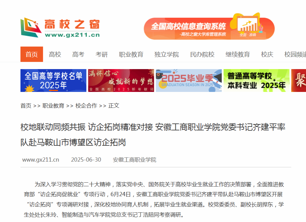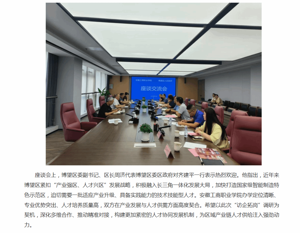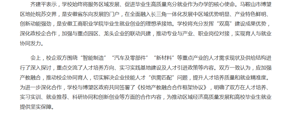 原文链接:【高校之窗】报道:校地联动同频共振 访企拓岗精准对接 安徽工商职业学院党委书记齐建平率队赴马鞍山市博望区访企拓岗
