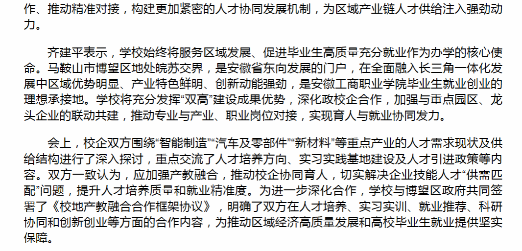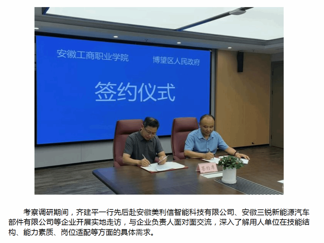 原文链接:【中国教育电视台官网】报道:校地联动同频共振 访企拓岗精准对接 安徽工商职业学院党委书记齐建平率队赴马鞍山市博望区访企拓岗