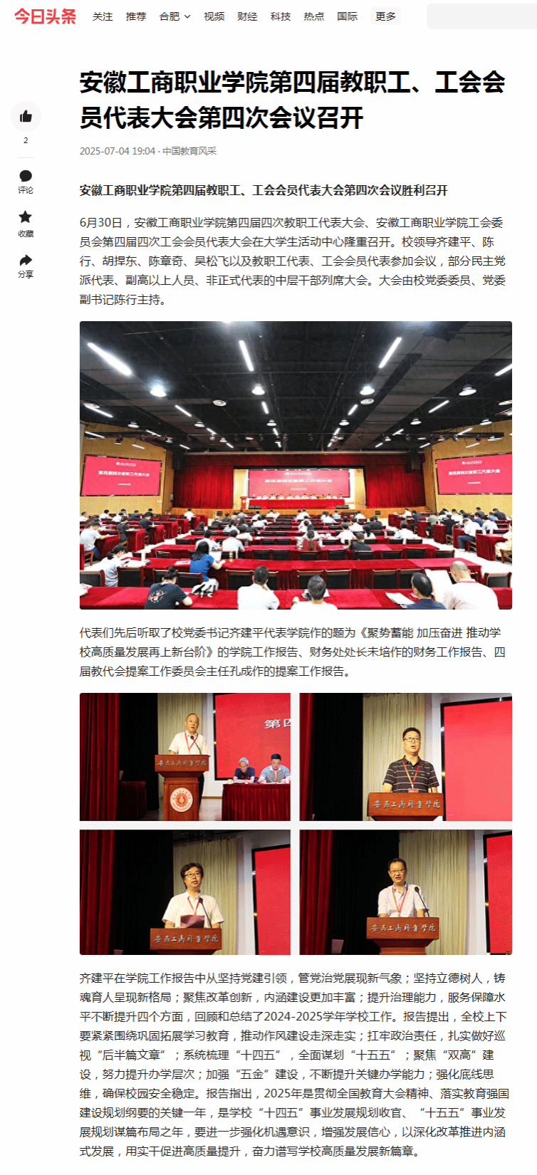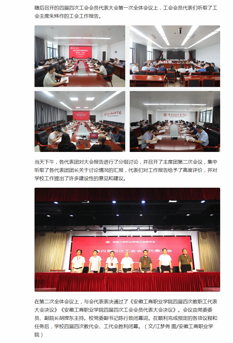 原文链接:【今日头条】报道:安徽工商职业学院第四届教职工、工会会员代表大会第四次会议胜利召开