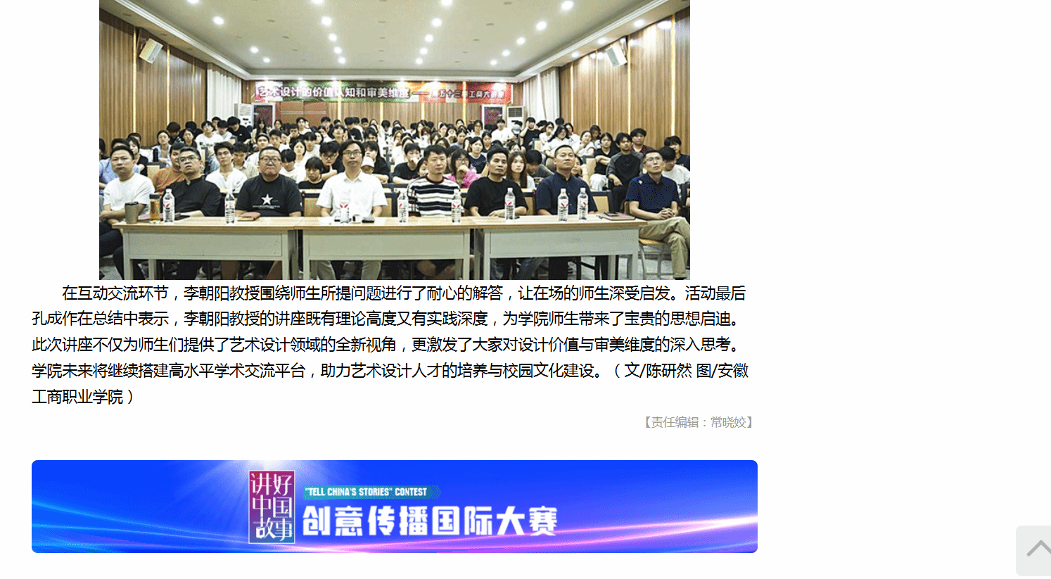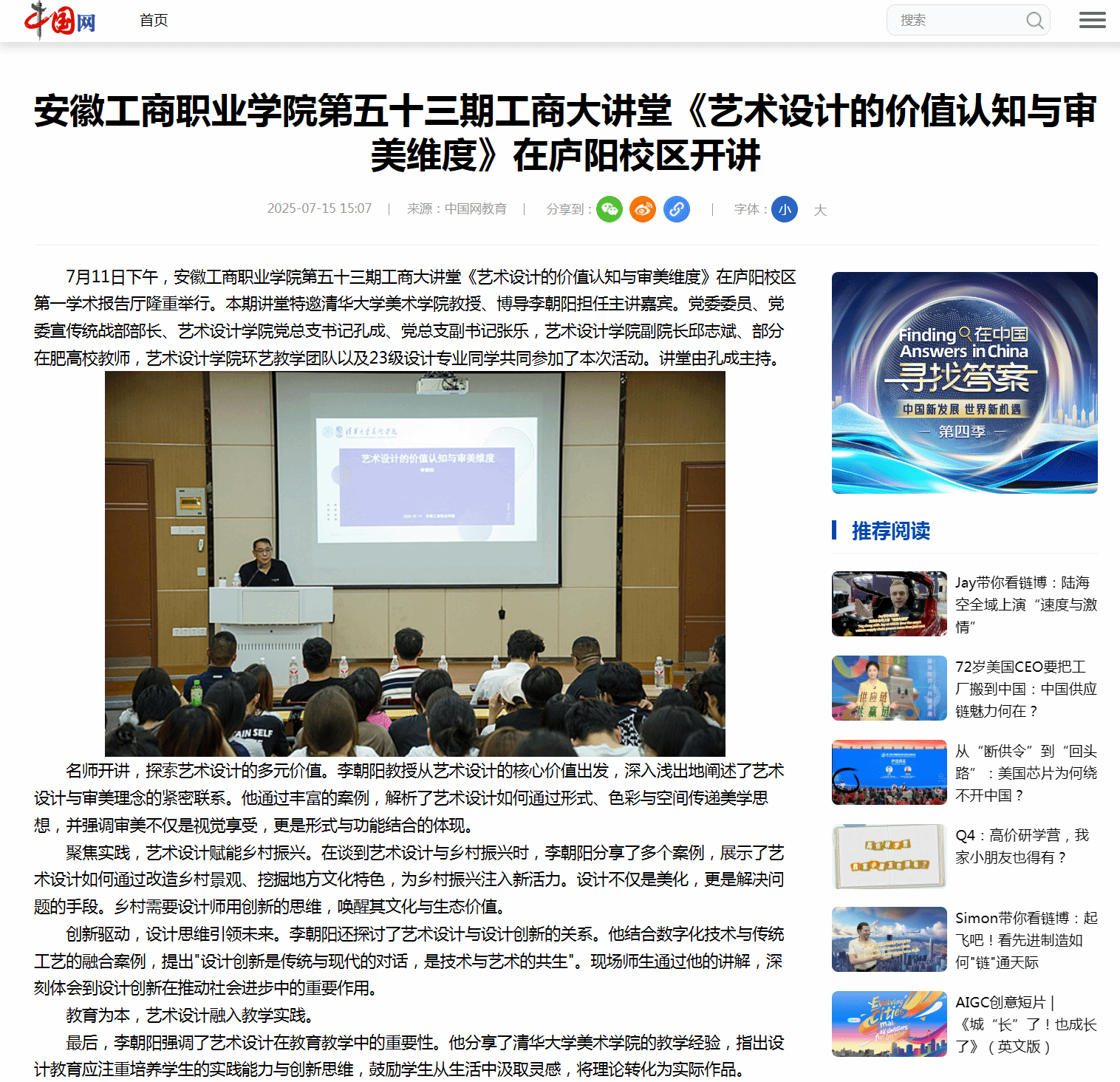 原文链接:【中国网】报道;安徽工商职业学院第五十三期工商大讲堂《艺术设计的价值认知与审美维度》在庐阳校区开讲_中国网