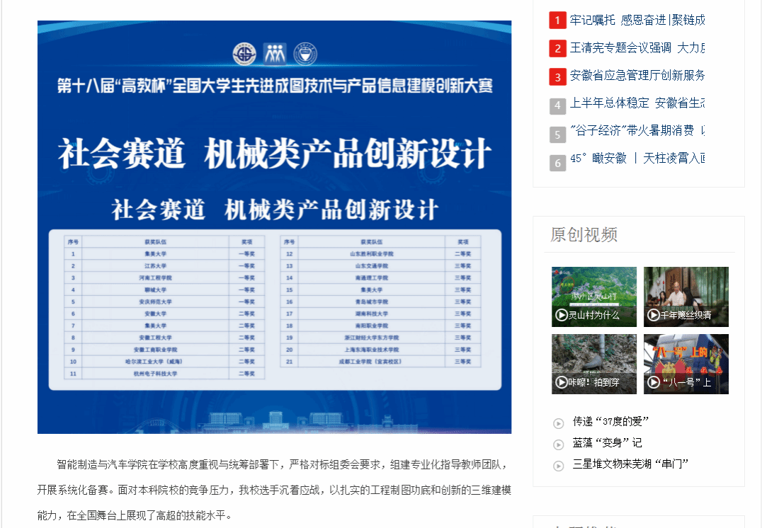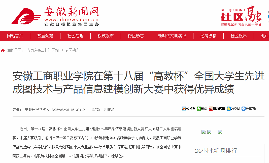 原文链接:【安徽新闻网】报道:安徽工商职业学院在第十八届“高教杯”全国大学生先进成图技术与产品信息建模创新大赛中获得优异成绩