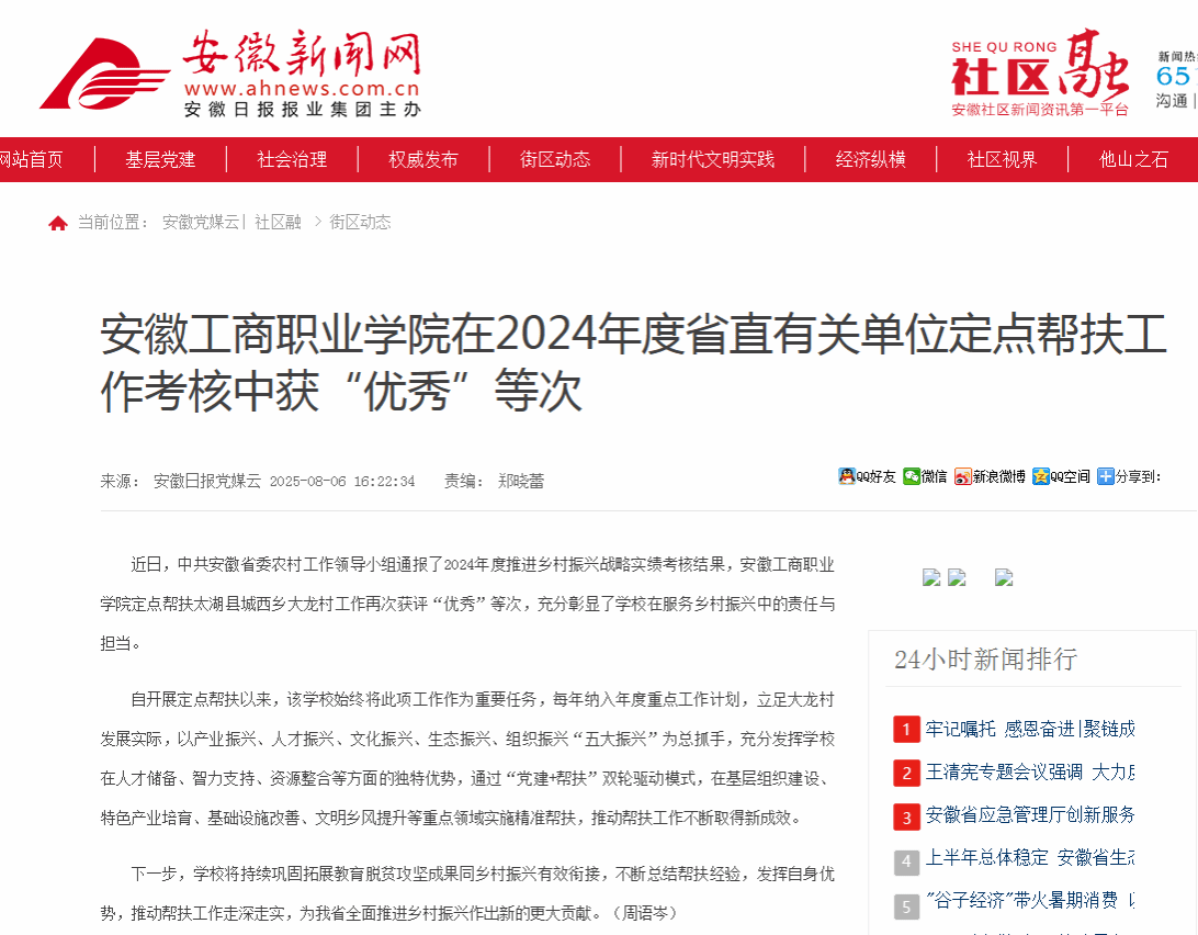 原文链接:【安徽新闻网】报道:安徽工商职业学院在2024年度省直有关单位定点帮扶工作考核中获“优秀”等次