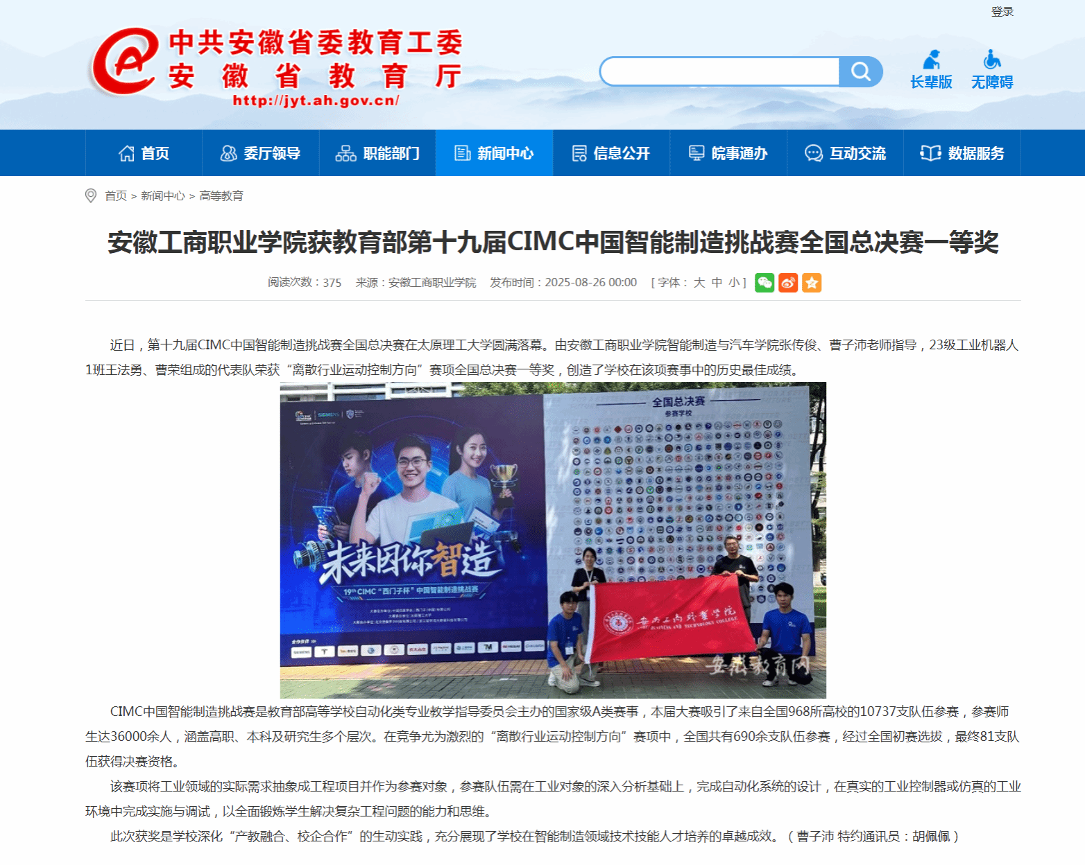 原文链接:【安徽教育网】报道:安徽工商职业学院获教育部第十九届CIMC中国智能制造挑战赛全国总决赛一等奖
