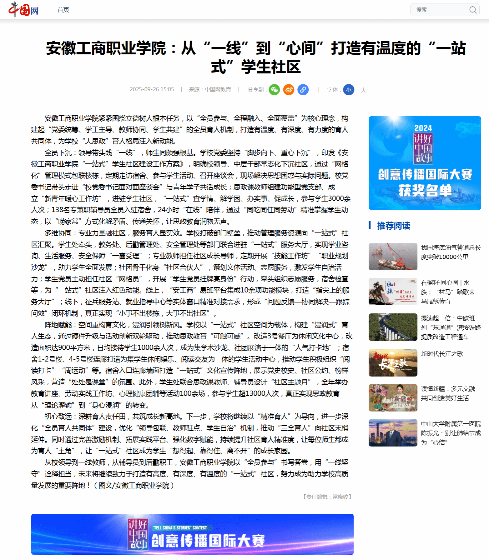 原文链接:【中国网】报道:安徽工商职业学院:从“一线”到“心间”打造有温度的“一站式”学生社区