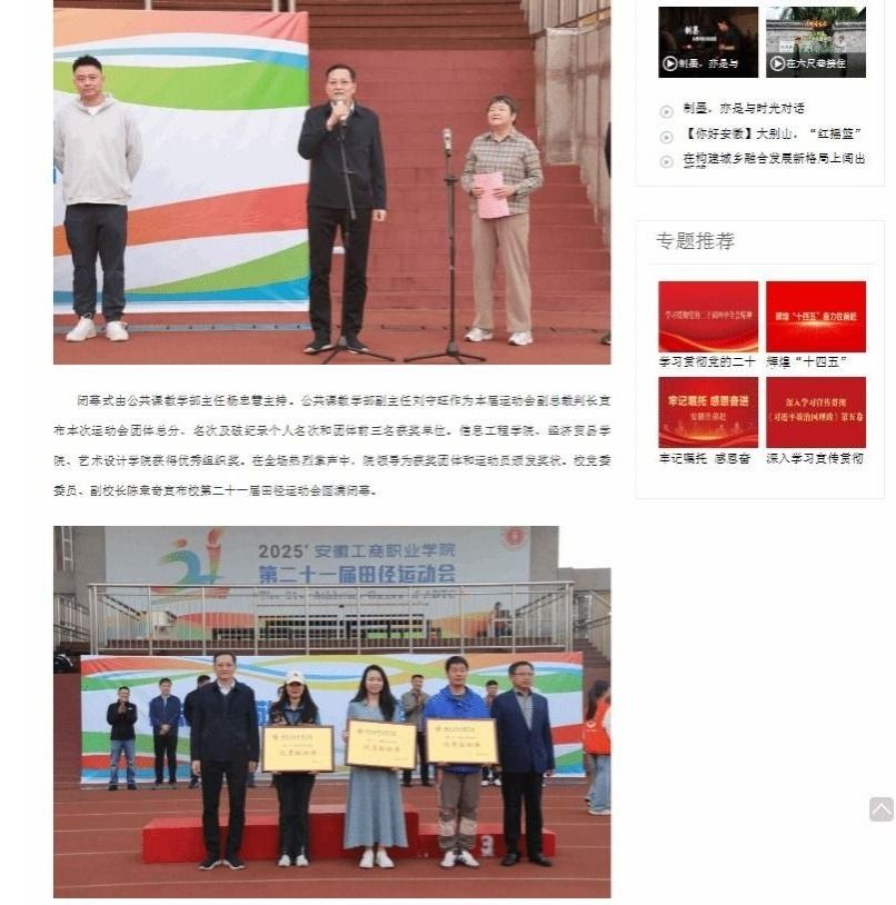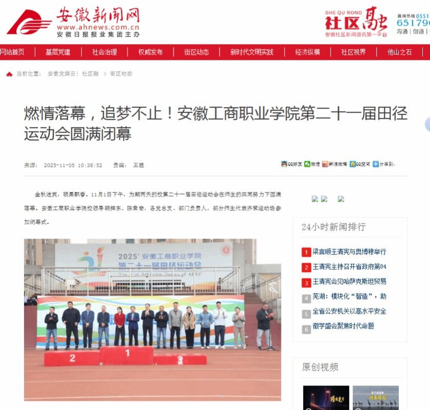 原文链接:【安徽新闻网】报道:燃情落幕,追梦不止!安徽工商职业学院第二十一届田径运动会圆满闭幕