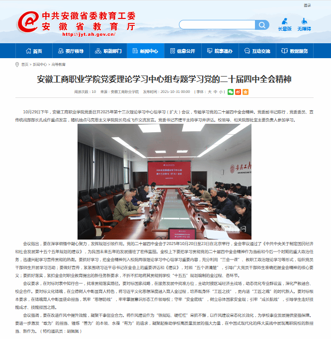 原文链接:【安徽教育网】首页报道:安徽工商职业学院党委理论学习中心组专题学习党的二十届四中全会精神