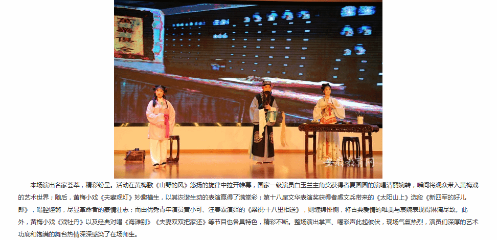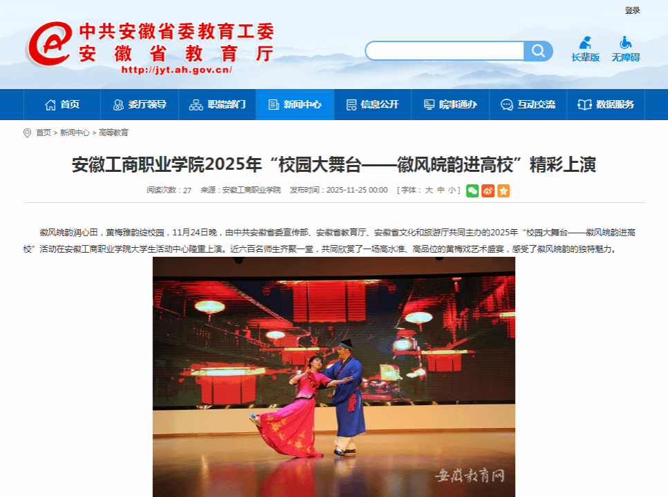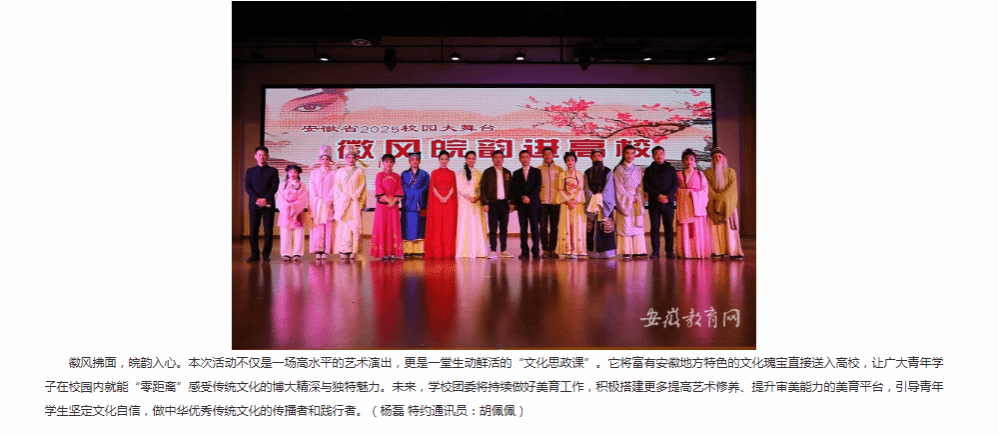 原文链接:【安徽教育网】报道:安徽工商职业学院2025年“校园大舞台——徽风皖韵进高校”精彩上演