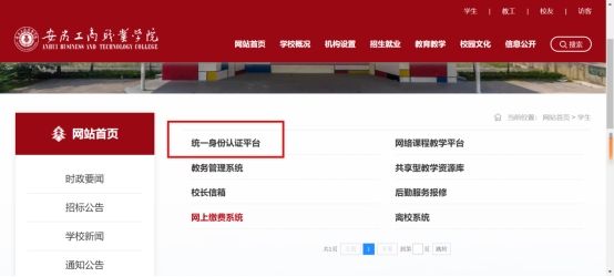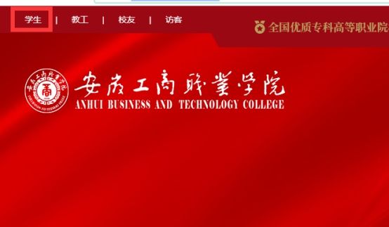 (二)搜索安徽工商职业学院官网,首页左上角选择 “学生”角色,单击统一身份认证平台,输入账号密码即可登录。