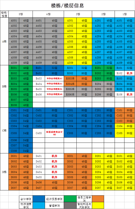 旅游健康学院 | 24 | 4 | A座(一层、二层)) B座(一层101-105,三层301-302) |