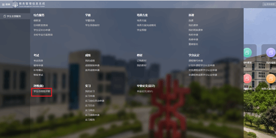 1.学生进入教务系统菜单页面点击[学生总结性评教]进入评教