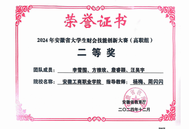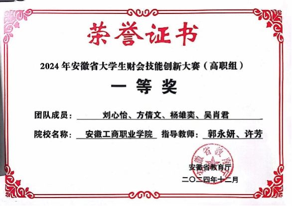 2024年安徽省大学生财会技能创新大赛高职组获一等奖、二等奖、三等奖各1项。