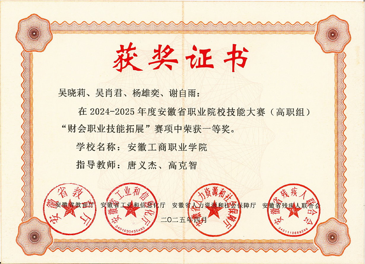 2024-2025年度安徽省财会职业技能拓展竞赛高职组获一等奖2项。