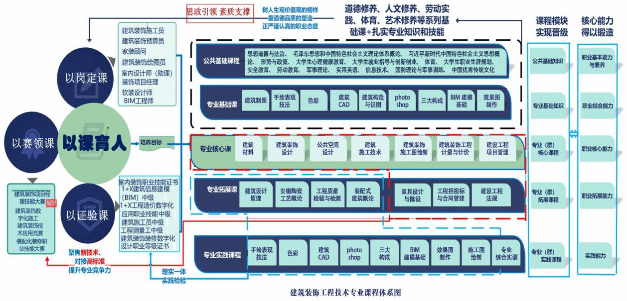 本专业面向建筑装饰和装修行业(产业)一线,按照宽口径、厚基础、高素质、强能力的人才培养规格,培养思想政治坚定,德智体美劳全面发展,综合素质优良,德技兼修,能在建筑装饰及相关新兴领域从事建筑装饰方案设计、图纸表现、造价与项目管理的住宅设计师、工装设计师、家具设计师、效果图表现师、施工图深化设计师、施工管理工程师、造价工程师、材料工程师等高素质职业技能人才。