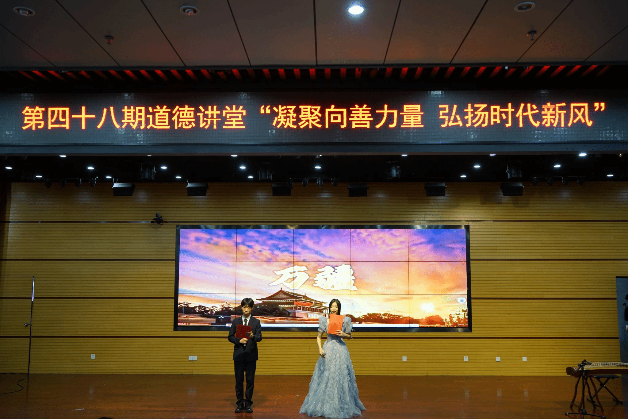 本期道德讲堂通过“学模范、诵经典、唱赞歌”三个篇章,弘扬时代新风,感悟道德力量。配乐朗诵《听党话 颂党恩 跟党走》、情景剧《德润人心》等节目,使大家不忘初心、牢记使命,坚定不移听党话、跟党走。红色舞台剧《红色乳娘》让在场观众受到了精神上的洗礼,在红色文化中汲取奋进力量。合唱《明天会更好》、《万疆》、《国家》展现了新时代青年朝气蓬勃、昂扬向上的精神面貌,唱出了对党对祖国的无限热爱。活动结束后大家纷纷表示要将所学所悟转化为干事创业的动力活力,以更加饱满的热情和奋发有为的精神状态积极投身工作和学习。