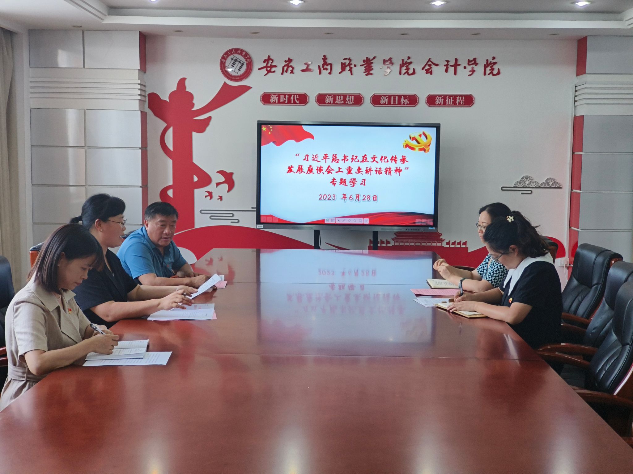 6月28日下午,会计学院党总支在明德楼党建会议室召开了理论学习中心组集中学习会,专题学习习近平在文化传承发展座谈会的重要讲话精神,学习贯彻习近平总书记在中共中央政治局第五次集体学习时的重要讲话,学习韩俊在安徽省委主题教育领导小组第二次会议暨主题教育座谈会的讲话,并围绕“坚定文化自信、建设教育强国”开展交流研讨。会议由党总支副书记、院长高克智主持,全体党总支委员参与了学习。