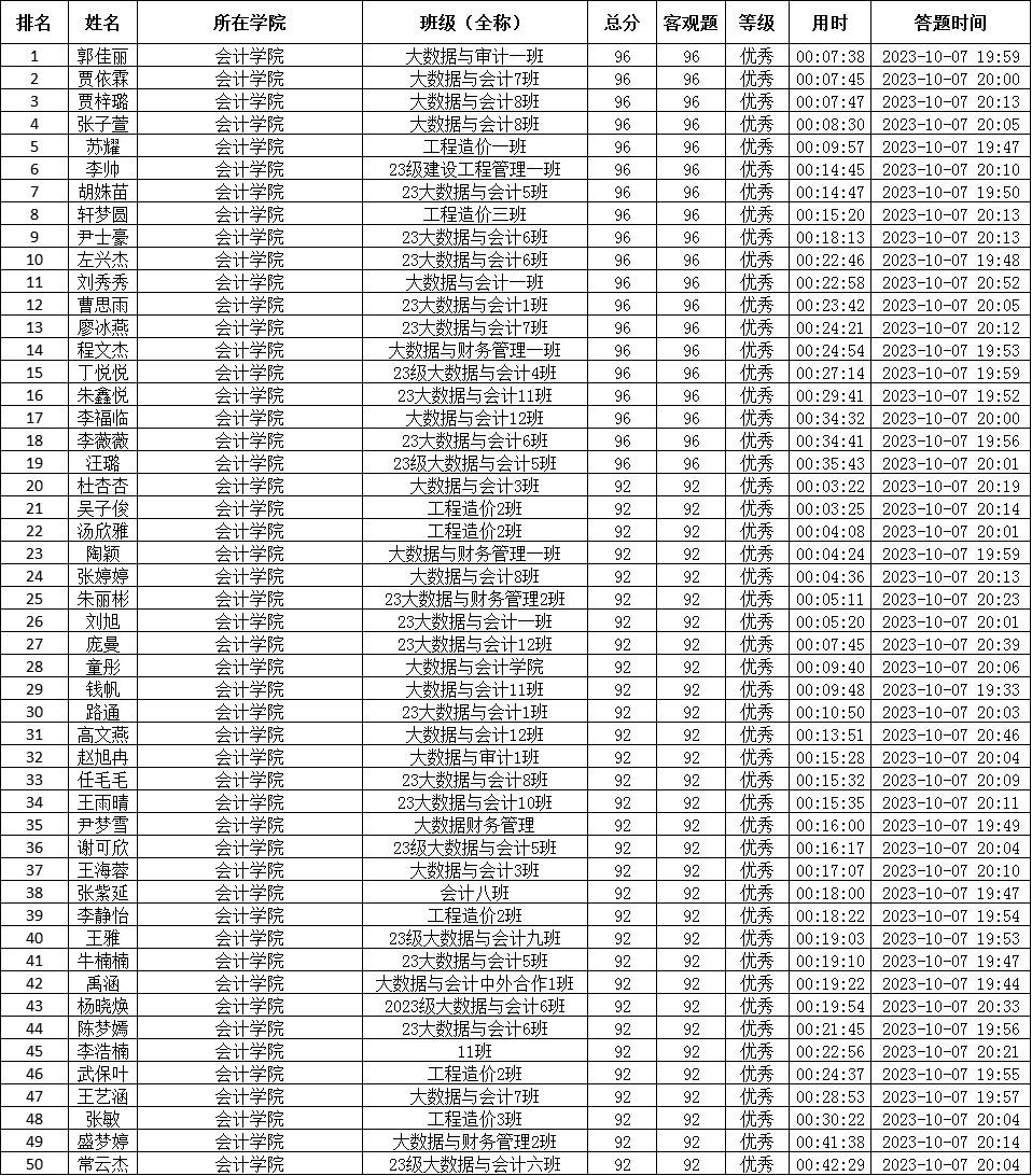 本次竞赛通过“赛事星”作为参赛平台进行线上答题,竞赛答题内容主要聚焦在大学之道、学籍制度、学业制度、奖助制度、校纪校规、生活制度等方面。本次竞赛覆盖会计学院2023级全体837名新生。经过激烈的答题后,最终郭佳丽等106位同学获得优秀等级成绩。