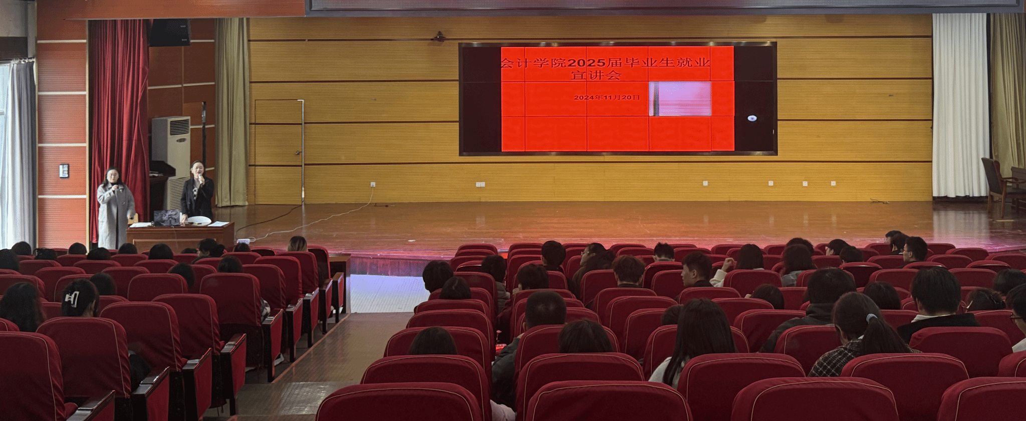 为做好2025届大学生就业和实习工作, 11 月 20日,会计学院在双凤校区学术报告厅举办了一场毕业生就业宣讲会。3家用人单位和部分毕业生参加会议,学院党总支副书记李峰主持。