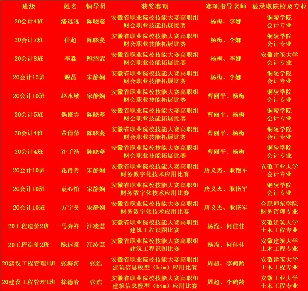 根据《安徽省2023年普通高校专升本报名和考试公告》,获得省教育厅等部门联合主办的全省职业院校技能大赛一等奖或教育部等部委联合主办的全国职业院校技能大赛三等奖及以上的高职(专科)应届毕业生,符合普通专升本考试招生报考条件并报考相应专业的,免于参加公共课考试,经本科院校面试通过,可直接录取。会计学院共有以下15名大赛选手分别被安徽建筑大学、安徽工业大学、合肥师范学院、铜陵学院等本科院校录取。