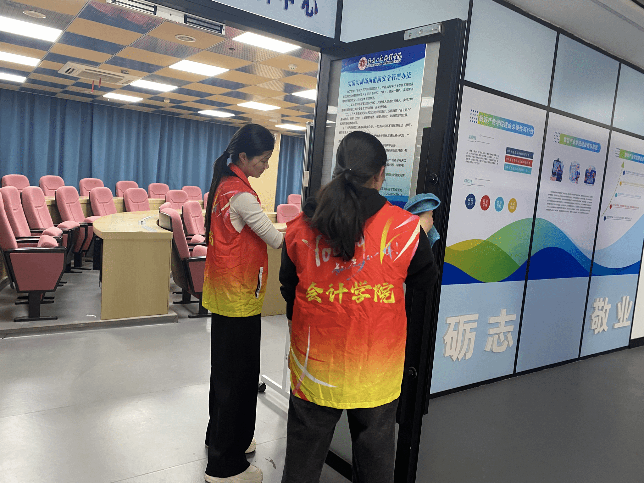 活动中,领队老师简短明了地讲解了注意事项并分配了任务后,学生党员们即刻投身到清洁工作中。实训室里,志愿者的身影忙碌而有序,他们遍布在各个角落。一部分志愿者手握抹布,一丝不苟地擦拭着电脑和桌面,确保每一处都光洁如新;另一部分志愿者则挥动着扫帚,细心清扫着地面的每一个角落,不放过任何一丝尘埃。大家齐心协力,共同为实训室营造了一个干净整洁的学习环境。
