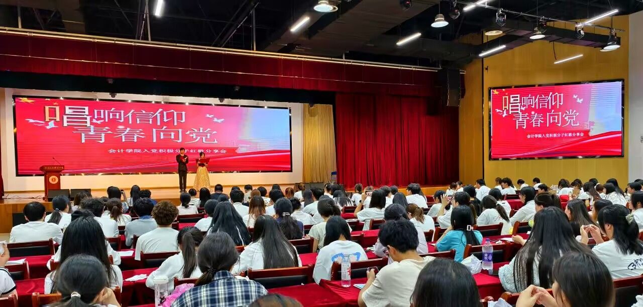 6 月 12 日,会计学院第 39 期入党积极分子培训 4 班于大学生活动中心举办 “唱响信仰、青春向党”红歌分享会。学院党总支副书记李峰、辅导员代表及全体学员以歌声为纽带,重温百年党史。