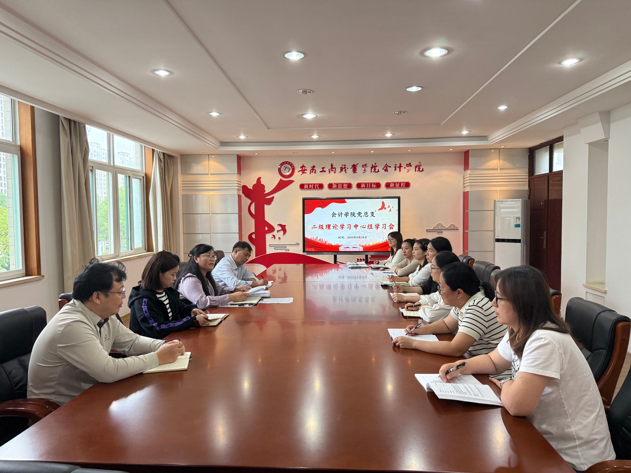 9月24日下午,会计学院党总支在明德楼二楼党建会议室召开9月理论学习中心组学习(扩大)会议,集体学习了《习近平谈治国理政》第五卷,深入学习了习近平总书记在中央政治局常委会会议上听取中国人民抗日战争暨世界反法西斯战争胜利 80 周年纪念活动总结报告时的重要讲话精神,同时专题学习了习近平总书记关于教育的重要论述、关于青年工作的重要论述以及给全国特岗教师代表的回信精神。党总支书记赵艳、宣传委员李霞、青年委员亓萌围绕学习内容作交流发言,赵艳主持会议并讲话,党总支委员及各党支部书记参加学习。