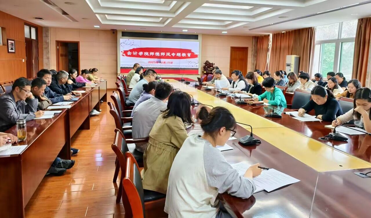 2025 年 10 月 15 日,会计学院在明德楼二楼二号会议室召开 10 月教职工政治理论学习会议暨师德师风专题教育活动,会议由学院党总支书记赵艳主持,全体教职工参加。