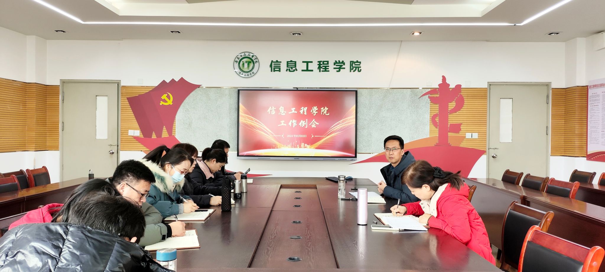 1月3日,信息工程学院在307活动室组织开展了2024年一月工作例会。此次会议就2024年专业调整、各专业招生计划数、分类招生大纲设定以及下学期授课安排等议题进行深入探讨和决策。